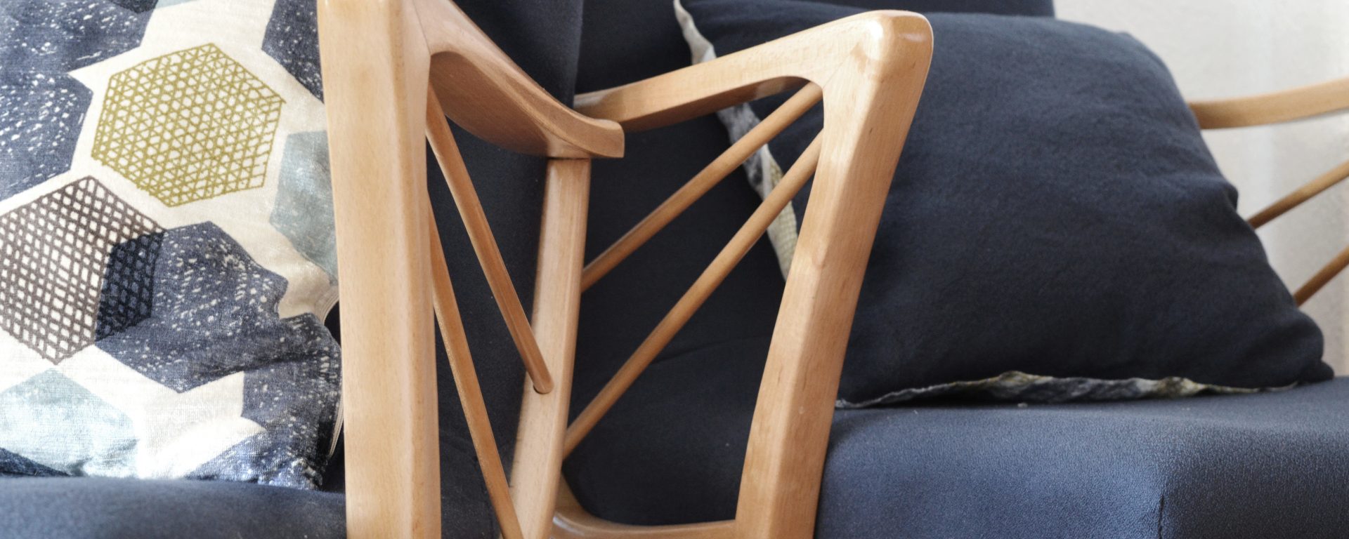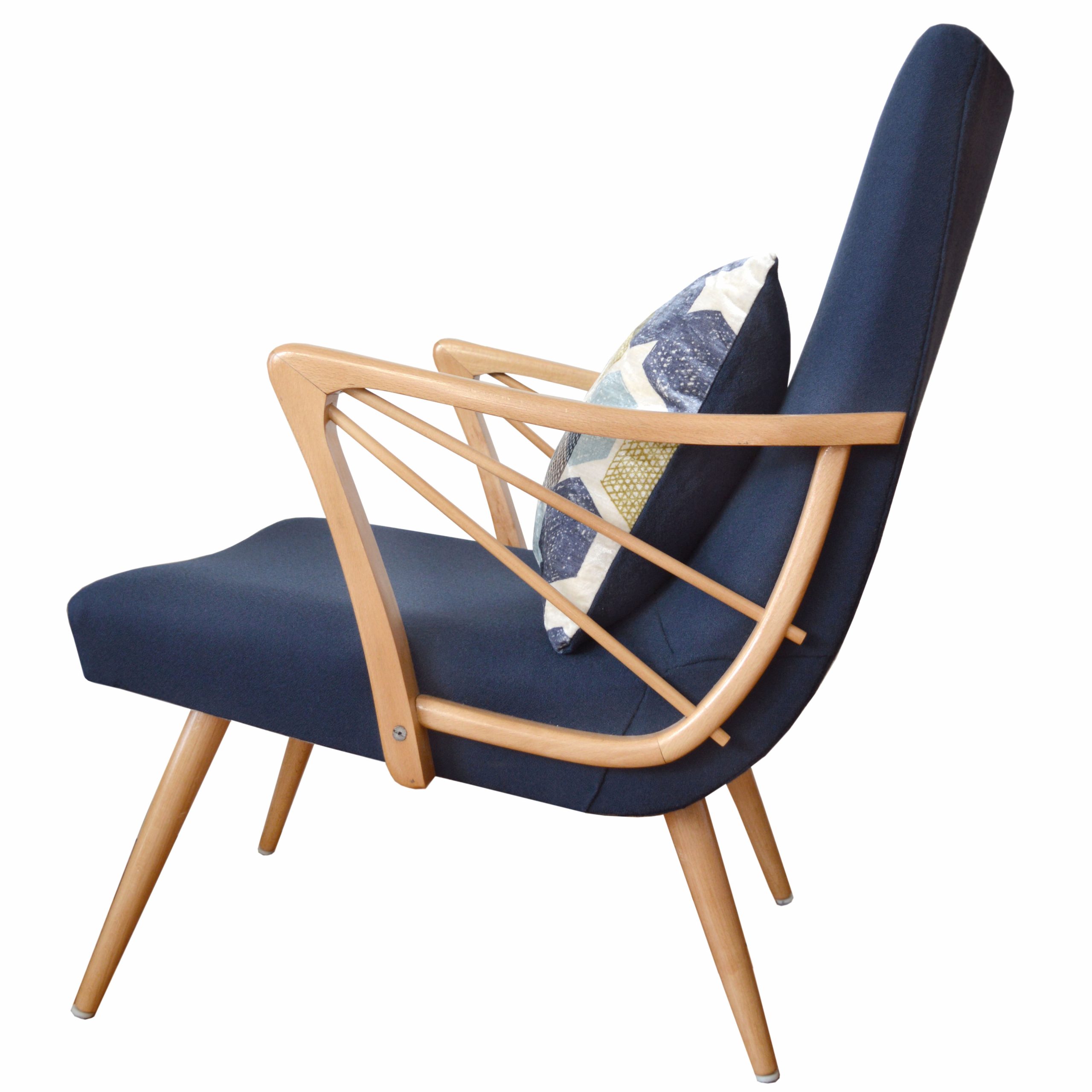 Natürlich sollte man den alten Lack wegmachen, leichte Satinbeschichtung kam als neue Oberfläche. Es musste nur noch der passende Stoff gefunden werden. Hier habe ich einen Laden mit den Fabrikresten von Polsterstoffen entdeckt. Wunderbare Ballen haben nur auf mich gewartet. Ich habe mich für die dunkelblaue, 100%-tige Wolle entschieden und nie bereut, was doch manchmal passiert.