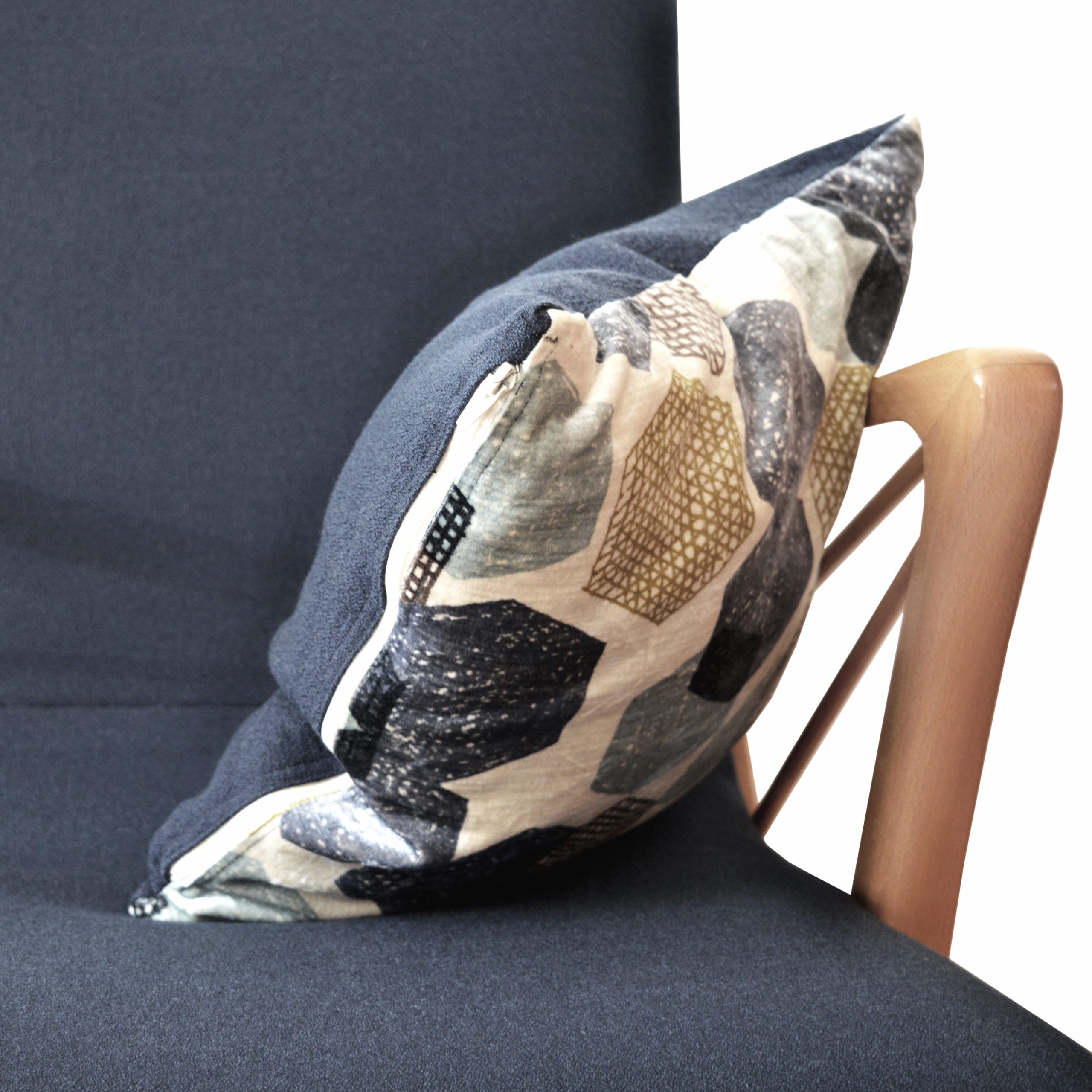 Dazu noch die Kissen. Den dunkelblauen Wollstoff habe ich ausreichend gekauft. Das Vorderteil ist aus einem Stoff, den ich zufällig in Wien fand. Er hat hat hier exakt gepasst.